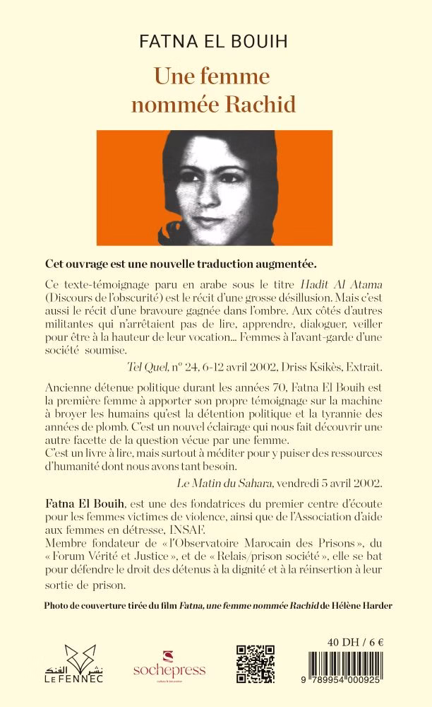 Ancienne détenue politique durant les années 70, Fatna El Bouih est la première femme à apporter son propre témoignage sur la machine à broyer les humains qu’est la détention politique et la tyrannie des années de plomb. C’est un nouvel éclairage qui nous fait découvrir une autre facette de la question vécue par une femme.